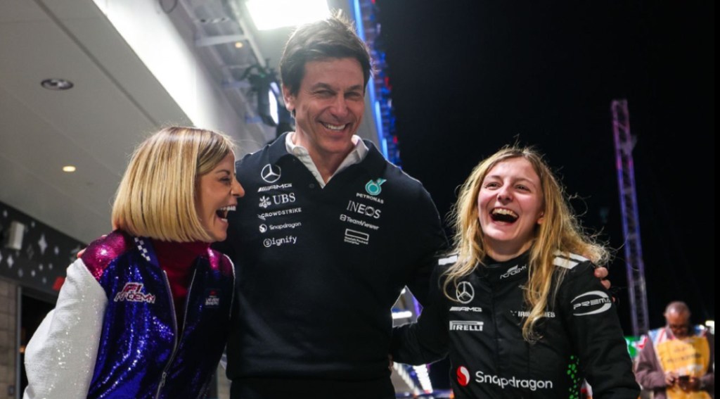 She was enthusiastically embraced by Susie Wolff, Mercedes Team Principal Toto Wolff, and F1 big brother-little brother pairing George Russell and Kimi Antonelli. Doriane described being “really proud of all the work [the team] have done since last year,” saying “champion is a beautiful word to really fit [their] season.”